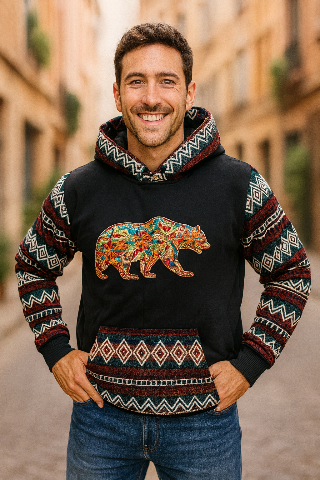 La sudadera Ukumari rinde homenaje al poderoso oso andino, símbolo de sabiduría y conexión con la naturaleza. Su diseño combina patrones étnicos con un impactante bordado floral en tonos intensos, evocando la energía y armonía de los Andes. Hecha para quienes caminan con fuerza, pero también con sensibilidad. Ideal para destacar con estilo, autenticidad y alma.